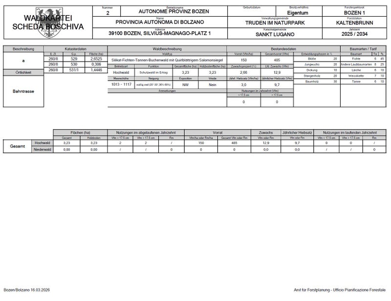 In Südtirol werden Wälder mit einer Größe von mehr als hundert Hektar nach einem Waldbehandlungsplan bewirtschaftet. Dieser wird alle zehn Jahre erneuert.