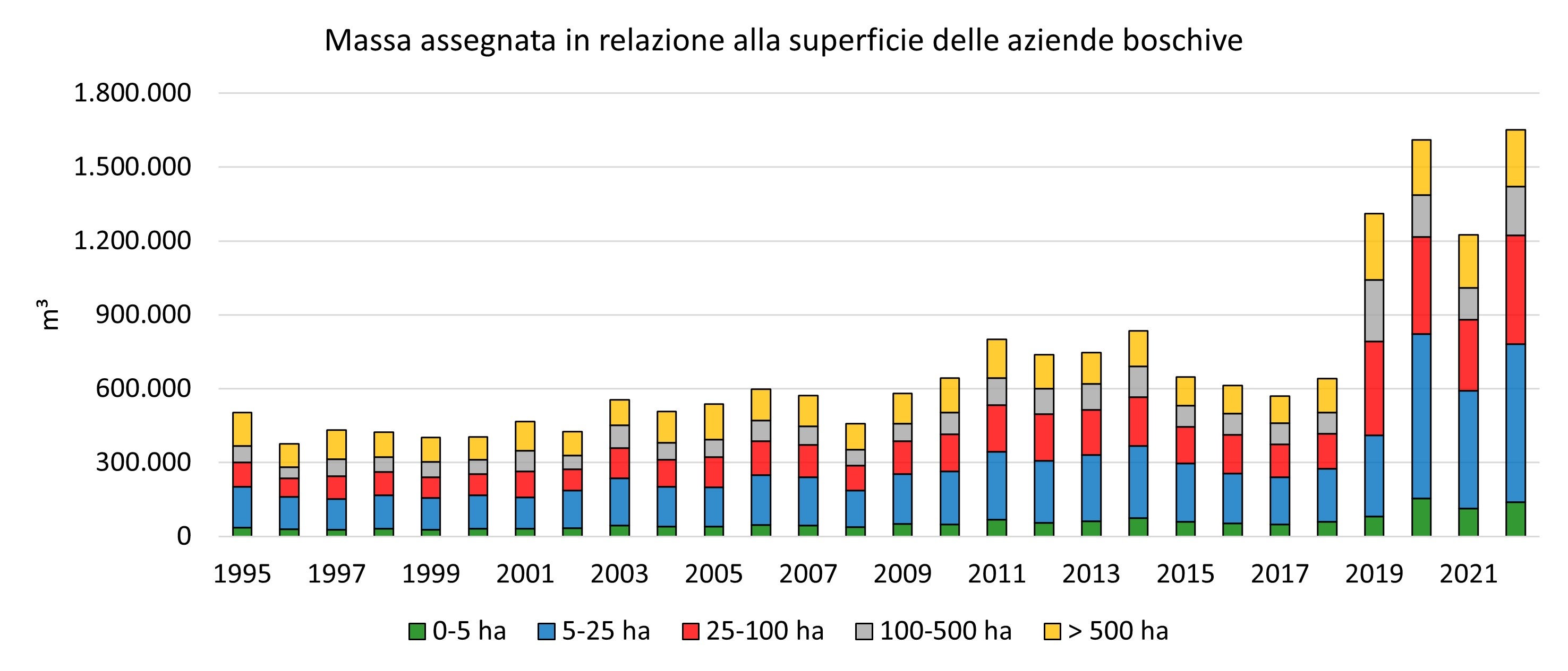 Nel grafico sottostante si può apprezzare l’andamento storico delle utilizzazioni con la massa legnosa assegnata (m³) e la relativa superficie forestale delle aziende boschive (ha) in un arco temporale che va dal 1995 fino al 2022. Tutte le classi gestiscono il bosco. La maggior massa legnosa viene utilizzata dai proprietari boschivi avente una superficie tra i 5 ed i 25 ha.