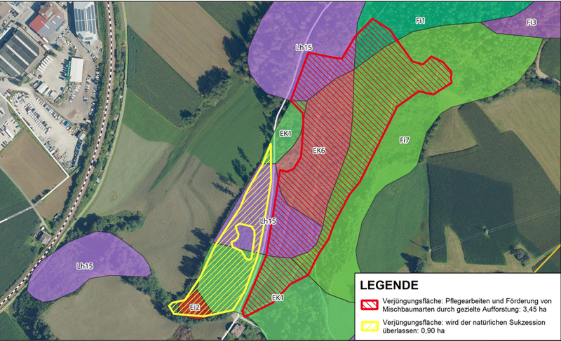 - La piantumazione di gruppi di latifoglie resistenti ai cambiamenti climatici (ad esempio castagno, tiglio a foglie piccole, noce, acero montano, ciliegio selvatico, faggio), nonché di abeti bianchi, mira ad aumentare la biodiversità ed il rapporto di miscelazione.