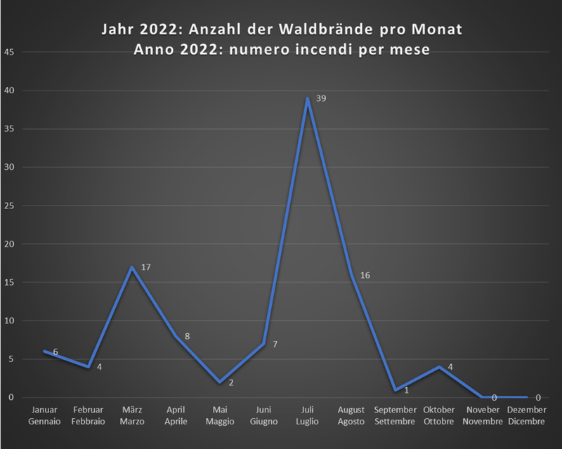 Sul numero totale degli incendi ha influito anche la piromania (oltre 30 incendi) che si è avuta nella zona di Bressanone, nella conca di Bolzano e nell’ Oltradige (bosco di Monticolo). Le indagini sono ancora in corso e i procedimenti penali aperti.